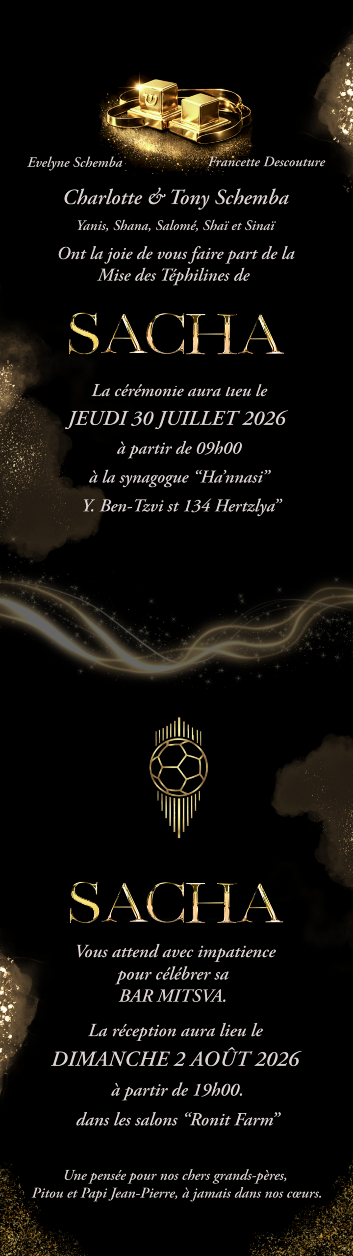 Et vous prie de bien vouloir les honorer de votre présence pour sa mise des téphilines qui aura lieu le